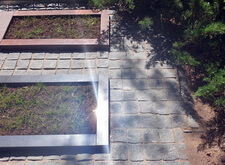 Перед тем, как закладывать участок брусчаткой, мы застелили территорию места захоронения геотекстилем, препятствующим дальнейшему прорастанию травы в швах между плитками.