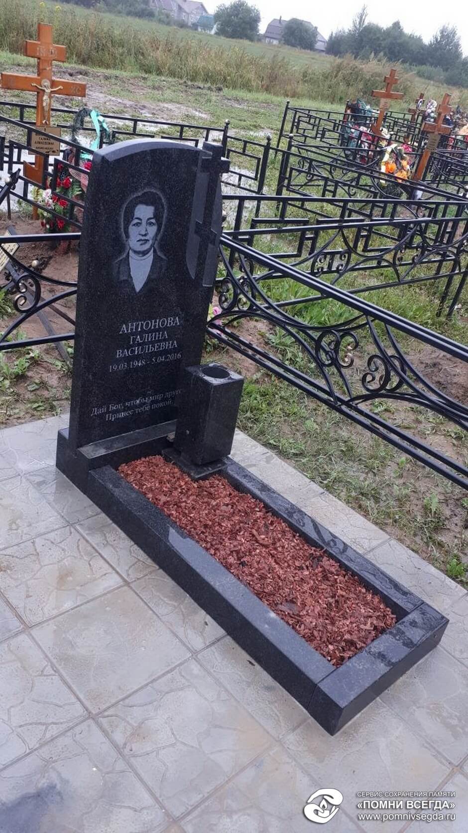 Далее мы перекрасили ограждение, установили подставку, сам памятник, прямоугольный цветник. Работу заканчивали в дождь, поэтому фотографий сухого место захоронения нет. На последнем снимке чётко видно, что даже на мокром памятнике выгравированная надпись очень легко читается.