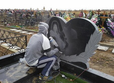 Портрет готов, пришло время сделать надпись. Мы будет делать ее методом пескоструя. Для начала нужно правильно наклеить трафарет, после песком под давлением воздуха набить надпись.
